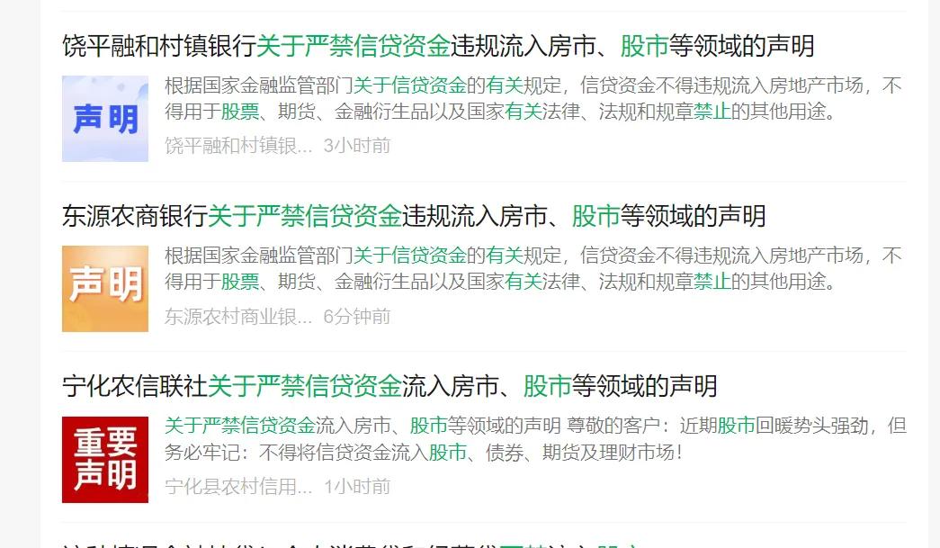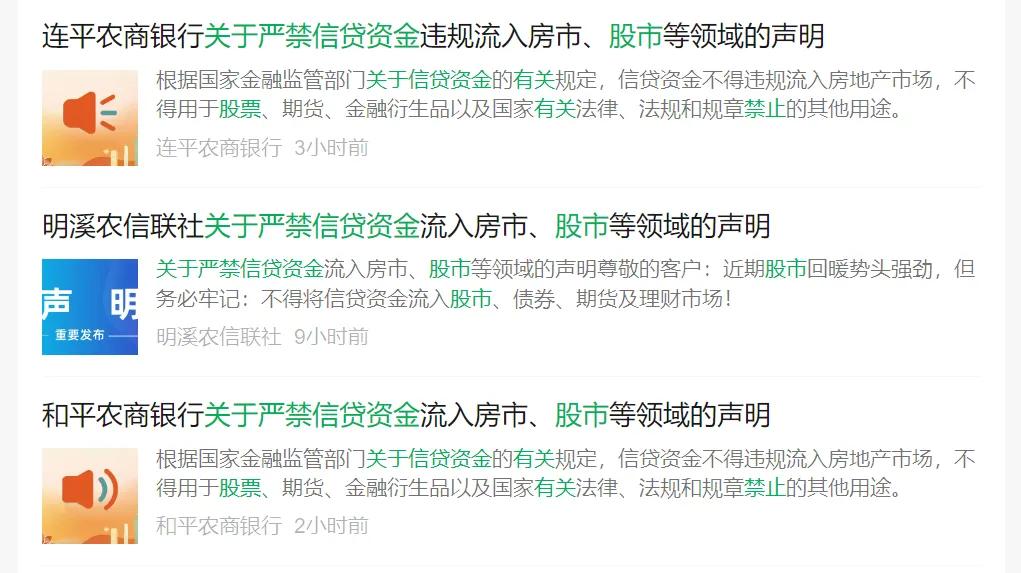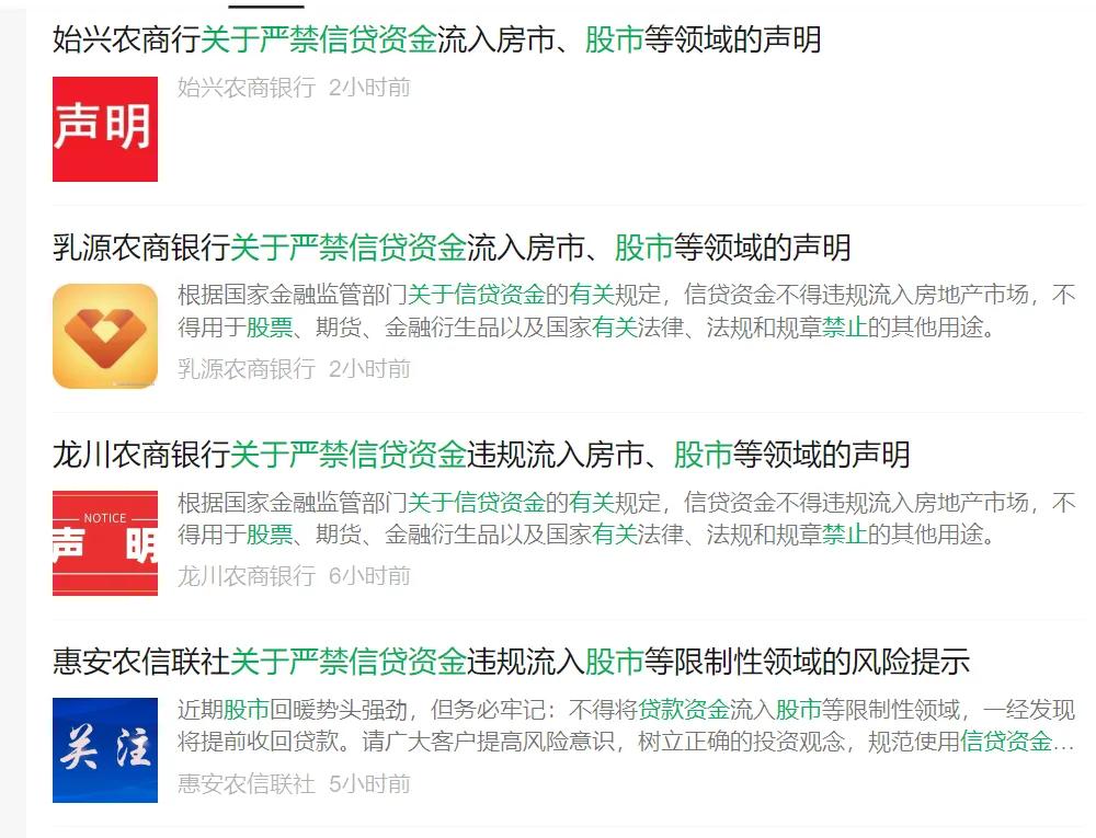 据不完全统计,10月9日发布相关声明的银行超过20家,主要以农商行或地方银行为主。对于违规入市的信贷资金,银行声明将提前收回贷款。