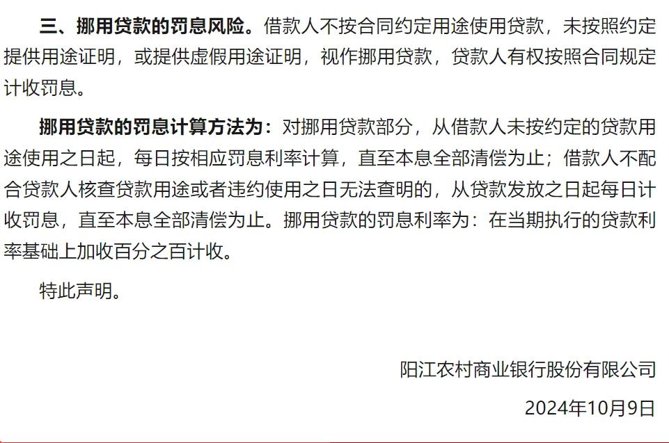 阳江农商银行在声明中还表示,对违规挪用的信贷资金将进行罚息,从借款人未按约定的贷款用途使用之日起,每日按相应罚息利率计算,直至本息全部清偿为止。挪用贷款的罚息利率在当期执行的贷款利率基础上加收百分之百计收。